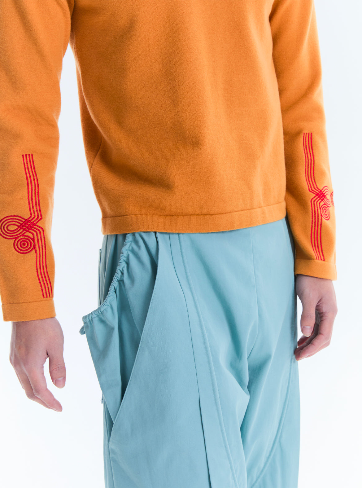 Knit top defined by sleeve geometry, where embroidered lines structure the arms and extend the garment’s proportions.